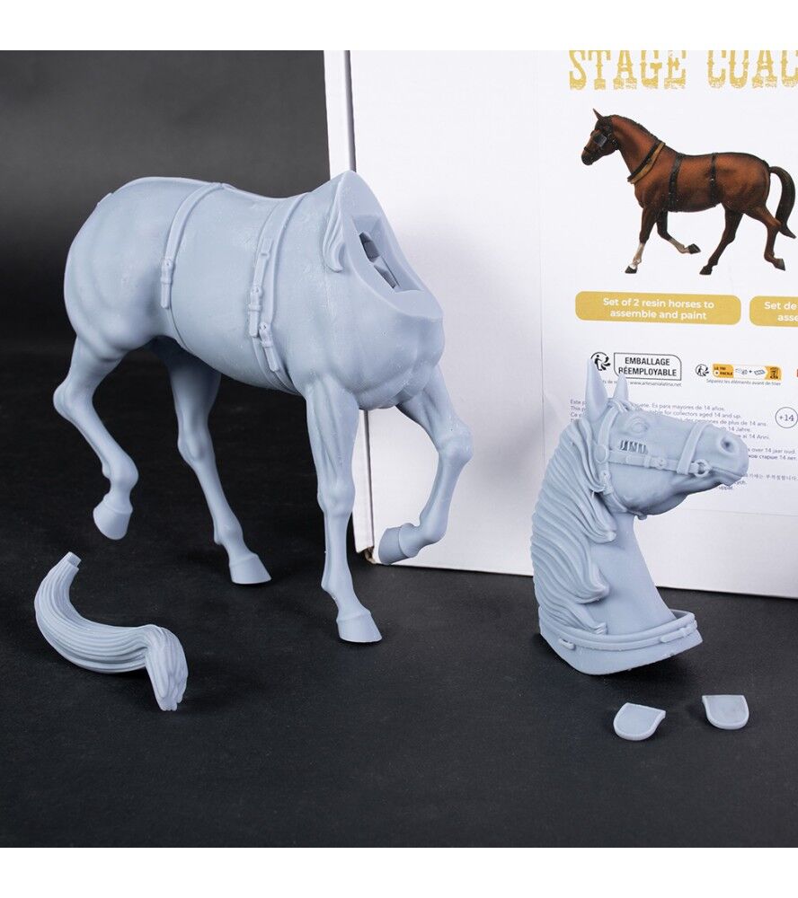This set of 2 high-density resin horses (item 20345H) is designed to complement the Artesanía Latina Stage Coach 1848 model kit (item 20345, sold separately). Crafted with exceptional detail in Europe, each horse features a one-piece body, separate head, tail, harness, and blinders, showcasing natural positions that capture the essence of the 1850s Wild West. Ideal for creating an immersive and historically accurate diorama.