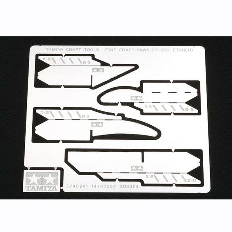 This set of thin craft saws is made from photo-etched metal to enable extremely fine cuts which are necessary for applying modifications to your models. When you use a standard craft saw for modification, you have to consider the thickness of the blade itself. However, as the blade has a 0.1mm thickness, the cutline is also very small. The set contains 4 straight and 1 curved saws and they can be used for cutting part as well as applying panel lining. The blades feature grips which can be folded over to increase support and this feature also allows them to be fitted onto the handle of the separately available Modeler's Knife (74040) for greater ease of use.